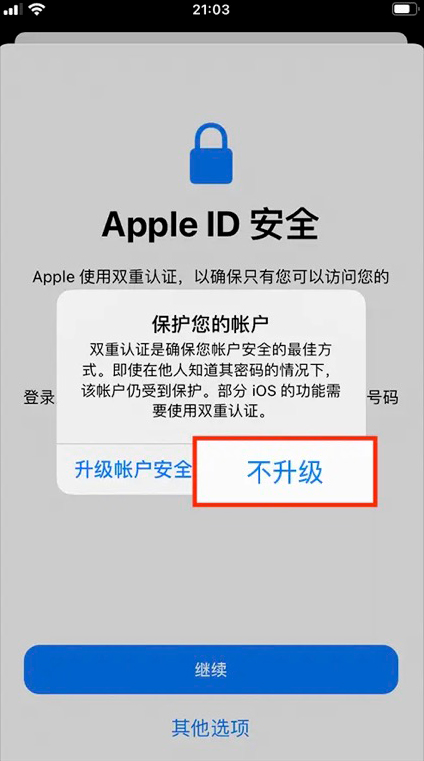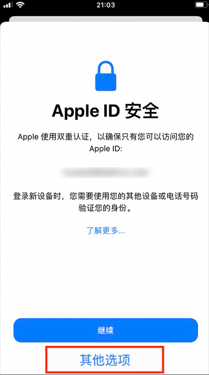登录ID后,会弹出AppleID安全页面,切记,请点击<其他选项>若没有此提示请忽略;